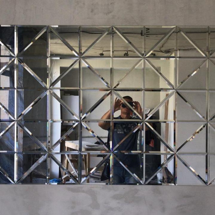 • Зеркальное панно в салоне, Москва, серебряная глянцевая плитка квадратной формы